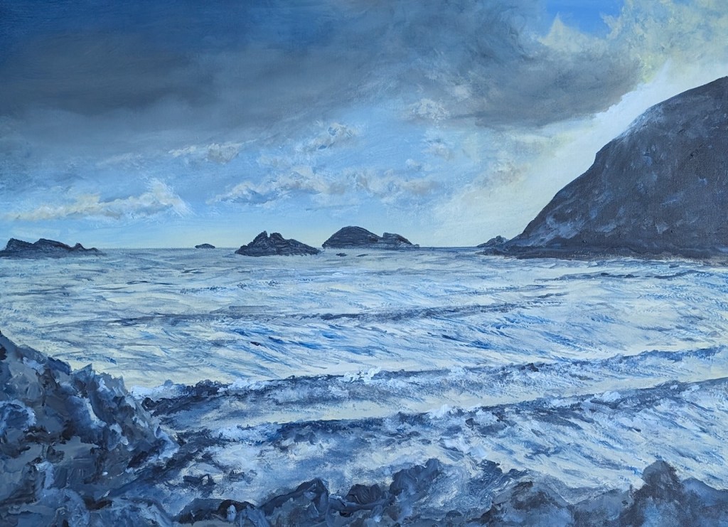 I do work in various media, although most of my paintings are produced with acrylic paints. As a consumer of art, I am eclectic in my tastes, and I have been unaware of adhering to one style in my own work as I like to experiment and paint different things that catch my interest, in different ways. However, there is a ‘signature’ beginning to appear in my later landscapes, seascapes and paintings of natural forms, leaning towards impressionism in the use of light, tinged with the broodiness of the expressionists.